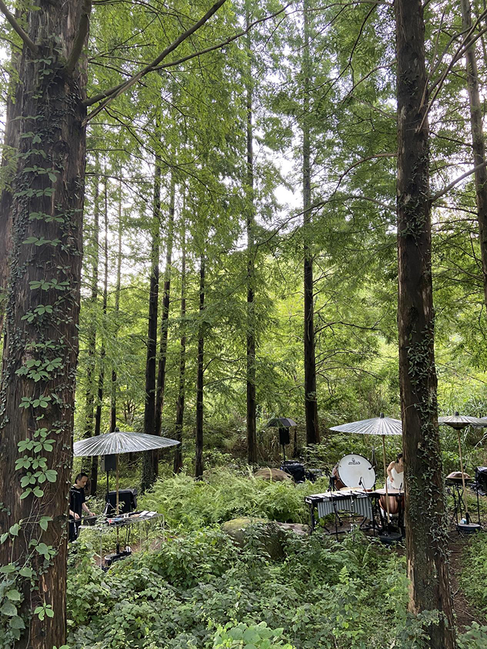 7月1日,筆者觀看了聲音現(xiàn)場(chǎng)作品 《林森鶴見(jiàn)》。傍晚時(shí)分,大雨席卷過(guò)后,雨過(guò)天晴,山林越發(fā)蔥郁,游覽車轉(zhuǎn)過(guò)一個(gè)山道,遠(yuǎn)遠(yuǎn)看到路邊人群或坐或臥地觀看演出:筆直挺拔的杉樹(shù)下, 蔓生的野草灌木中,豎著四張大傘,傘下三位黑衣男子與一位白衣女子正凝神演奏著手上的樂(lè)器,打擊樂(lè)響亮的音色和強(qiáng)烈節(jié)奏感,伴隨著悠長(zhǎng)詭譎的樂(lè)聲,將森林的神秘與悠遠(yuǎn)烘托到了極致。耳邊縈繞的樂(lè)音,眼前森綠的草木,讓現(xiàn)場(chǎng)觀眾體驗(yàn)到自然劇場(chǎng)強(qiáng)烈的氛圍。