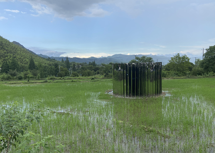 除竹林以外,水田也是作品集中之地。午后陽(yáng)光下,田野里藍(lán)紅橙白四面“旗幟”閃閃發(fā)光,那是攝影師尹超為人類最日常的食物——麥子在春夏秋冬四季拍攝的巨幅肖像,讓我們珍視這些人類最不可或缺的生命價(jià)值。建筑師孫大勇的作品《夢(mèng)》 以一個(gè)巨大白色睡枕構(gòu)成“夢(mèng)”的主題,盡管是金屬作品,卻具有織物般的溫和質(zhì)感,最初作品預(yù)想置于稻田中央,考慮到對(duì)莊稼的影響,最終就放置在田地邊緣。
