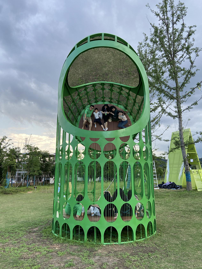 “在青山?群響藝術(shù)季”戶外裝置分散在村內(nèi)外的草坪、田野、森林和水庫(kù)沿線,需要一番探尋才能一窺真容。7月初的青山村,已進(jìn)入梅雨季節(jié),高溫悶熱,不時(shí)有陣雨突至,游客如憑腳力確是辛苦。為此,筆者聯(lián)系了本次藝術(shù)季的主辦方之一“阿里巴巴設(shè)計(jì)”的相關(guān)負(fù)責(zé)人陳棟、曉雪和王津。在他們的安排下,筆者坐上游覽車,沿著Y形主路沿途觀看作品,拂面的風(fēng)將悶熱一掃而空,愜意清爽。