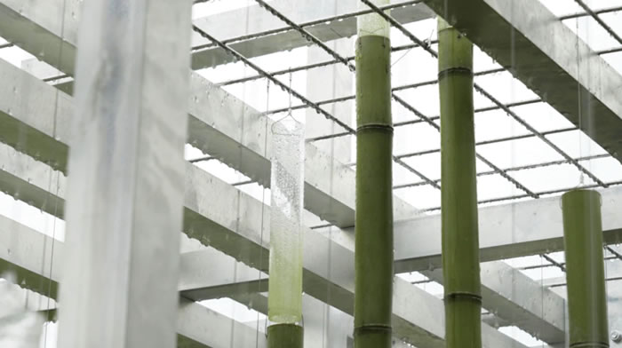 設(shè)計(jì)靈感源自水面漣漪,巧妙地將房屋、橋梁和碼頭連接在一起。用竹與線兩種材料進(jìn)行彎曲與編織,以仿效自然的方式,既回應(yīng)了當(dāng)?shù)氐沫h(huán)境,又強(qiáng)調(diào)了可持續(xù)性和美感。在場(chǎng)地中自由穿梭,突破建筑的框架與水陸的邊界。一剛一柔,若隱若現(xiàn),形成對(duì)比,引人駐足?!八@” 不僅是一件裝置藝術(shù)作品,更是對(duì)大坊橋這個(gè)歷史名村的一次深刻反思,提醒我們,鄉(xiāng)村傳統(tǒng)文化可以與現(xiàn)代藝術(shù)相結(jié)合,以新的方式煥發(fā)古村、古宅的生機(jī)。