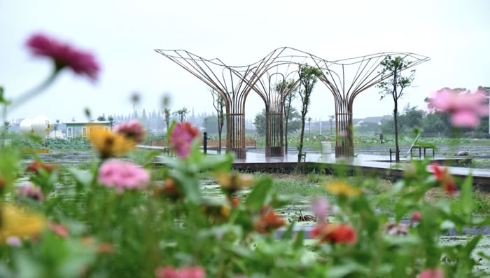 作品“蘭亭”,搭建在三洞橋村蓮花蕩入口不遠(yuǎn)處的一片荷花池旁。這里有山有湖泊、有荷花池、有高標(biāo)準(zhǔn)農(nóng)田,自然景色優(yōu)美、農(nóng)業(yè)特色資源豐富。