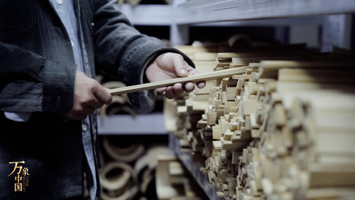 王健在庫房中為制扇挑選上等竹料