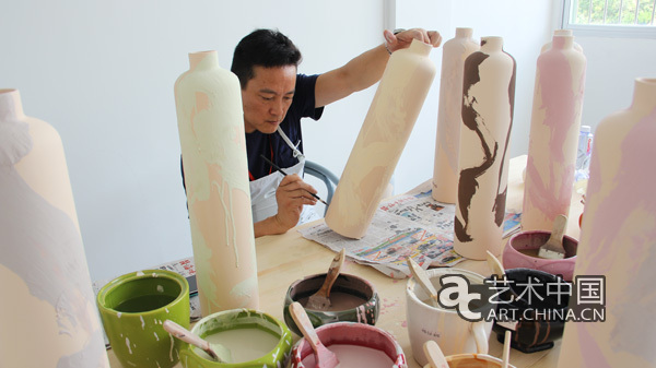 藝術(shù)家陳向東和張嵐軍去年曾在景德鎮(zhèn)進(jìn)行陶瓷繪畫。他認(rèn)為德化的陶淳樸粗獷,景德鎮(zhèn)則要細(xì)膩得多。意大利藝術(shù)家Gaetano Di Gregorio是一位陶瓷設(shè)計(jì)師,他曾經(jīng)在景德鎮(zhèn)創(chuàng)作時(shí)使用家用材料,對(duì)景德鎮(zhèn)的青花瓷印象深刻,此次來德化的創(chuàng)作,他將很多工廠里花瓶的碎片粘貼到完整花瓶的瓶口上,經(jīng)過高溫窯變出來的作品充滿當(dāng)代和時(shí)尚的氣息。