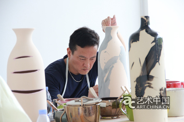 與張嵐軍一樣,美籍華人、藝術(shù)家陳向東也是第一次接觸陶,陳樸的、粗獷的胚體融入當(dāng)代的語言,結(jié)合器物本身的形體將繪畫性和裝飾性統(tǒng)一到陶器上是陳向東此次來創(chuàng)作進(jìn)行的嘗試。
