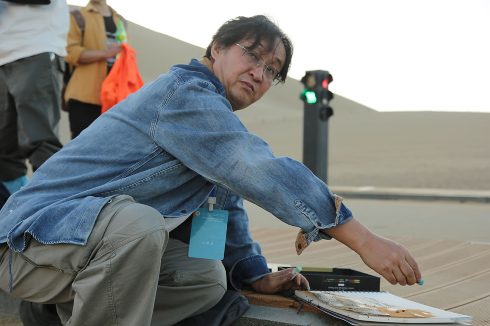 中國藝術(shù)家白建濤在鳴沙山月牙泉景區(qū)寫生