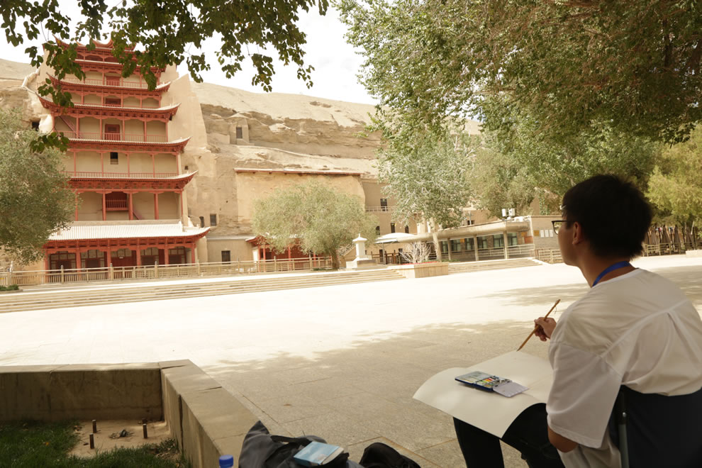 中國藝術(shù)家駱驍在莫高窟九層塔前寫生