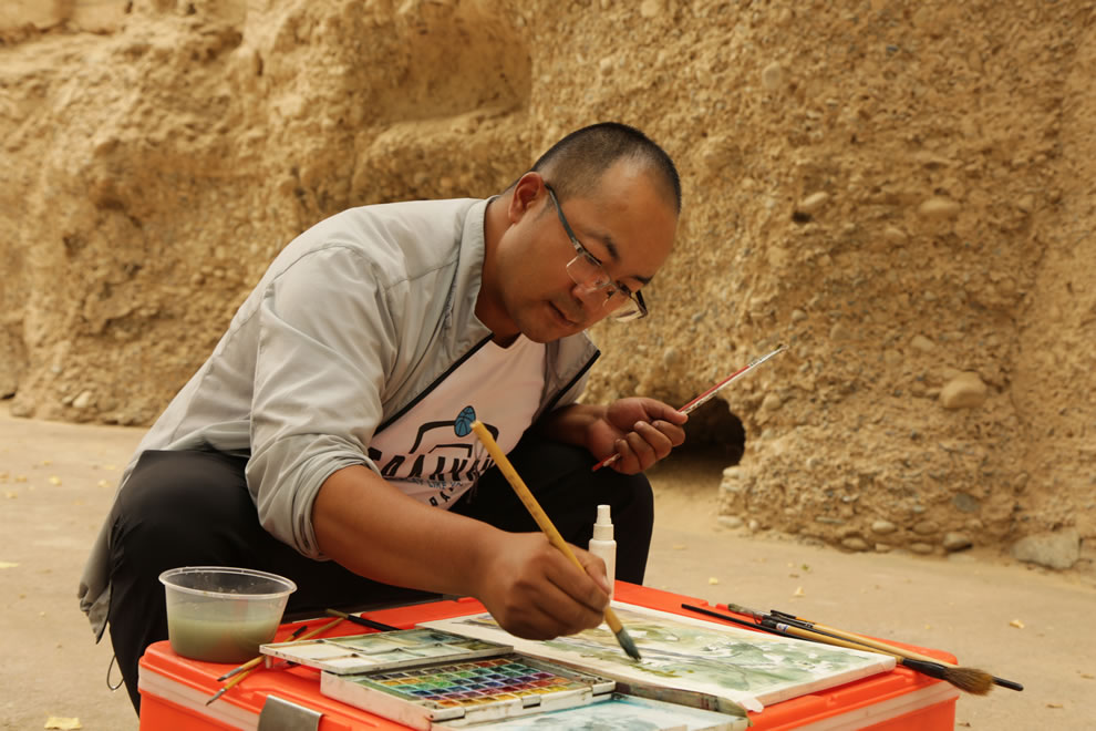 中國(guó)藝術(shù)家白建濤在西千佛洞前寫生