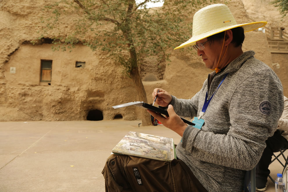 中國藝術(shù)家白建濤在西千佛洞前寫生