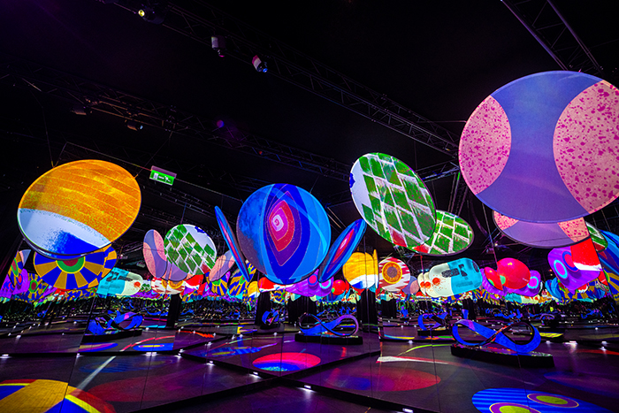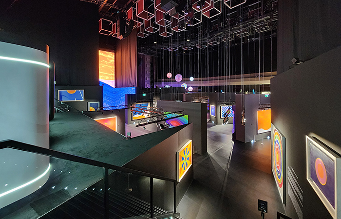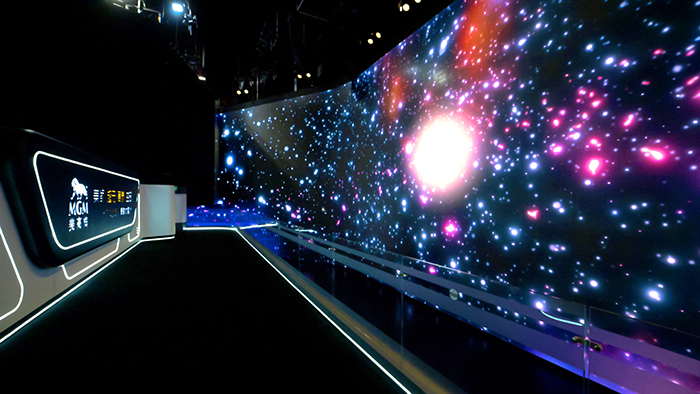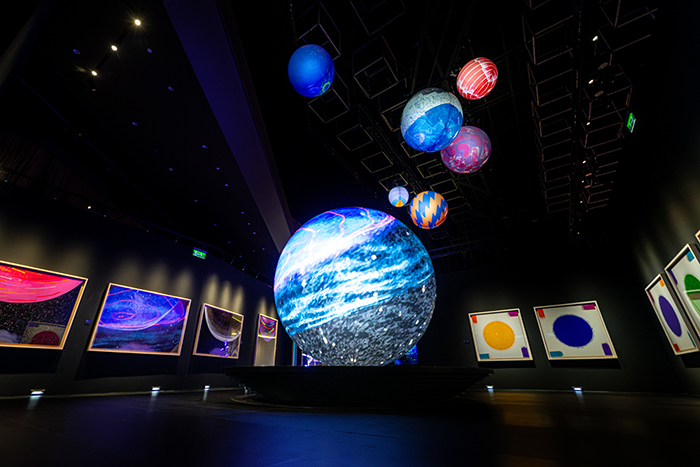 位于澳門美獅美高梅的美高梅劇院擁有全球室內(nèi)最大的永久超高清LED顯示屏,面積達(dá)900平方米,相當(dāng)于3個(gè)網(wǎng)球場(chǎng)面積,可以為觀眾呈現(xiàn)2800萬(wàn)像素的觀賞體驗(yàn)。數(shù)字化、沉浸式的“蕭勤的藝術(shù)宇宙”在這里成為現(xiàn)實(shí)。策展人用8個(gè)展區(qū)構(gòu)成了蘊(yùn)含“無(wú)限∞”的回行路線,打破了現(xiàn)場(chǎng)與虛擬的邊界,讓蕭勤作品中表達(dá)的中華傳統(tǒng)哲學(xué)觀和宇宙觀深入淺出地呈現(xiàn)在觀眾面前,也以“數(shù)字化”的方式完成了蕭勤的“太空探索”夢(mèng)想。