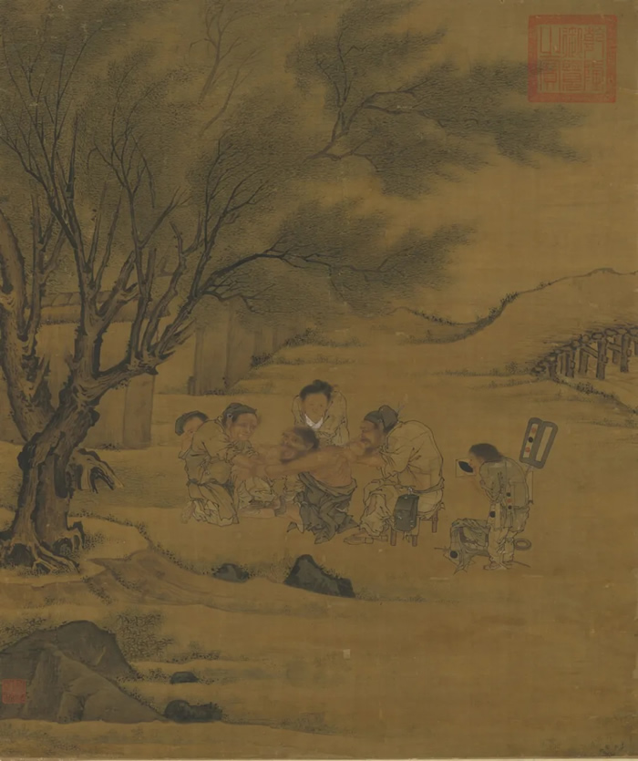 這次展覽通過(guò)一種比較泛化的主題,呈現(xiàn)了“耕讀”的很多細(xì)節(jié)。比如展覽里有一幅《觀畫圖》,作者是明代畫家張路。這幅畫表現(xiàn)了一個(gè)郊野或者鄉(xiāng)村之中,一個(gè)拿畫的人拿來(lái)一幅古畫,大家圍攏起來(lái)觀看。畫面表現(xiàn)得非常生動(dòng),有市井生活中的煙火氣,同時(shí)又帶有一種大家對(duì)于風(fēng)雅,對(duì)于書畫的渴望。這幅畫的構(gòu)圖和南宋李唐的名作《村醫(yī)圖》有著異曲同工之處,《村醫(yī)圖》很生動(dòng)地表現(xiàn)一位村醫(yī)郎中在給鄉(xiāng)村的農(nóng)夫治病貼膏藥,場(chǎng)景很夸張,具有戲劇性的喜感。