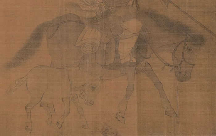 所以作者描繪蔡文姬歸漢的過程,雖然是一個(gè)定格的畫面,里面透露的信息卻非常之多,比如引路的胡人扛著旗,騎著一匹大馬,大馬旁邊跟著一匹小馬駒。小馬駒有兩個(gè)指意:第一,歸漢不可能帶一匹懷孕的馬,或者大馬帶一匹小馬,只能說明小馬是在歸漢途中生育的,側(cè)面反映出歸漢路途漫長(zhǎng),連小馬駒都生出來了;第二,蔡文姬歸漢,她是和自己孩子骨肉分離,據(jù)說她生育了兩個(gè)孩子。小馬尚且能依偎在母親身邊,蔡文姬只能形單影只,孤孤零零地回家。這也就襯托出蔡文姬內(nèi)心母子分離的愁緒,也側(cè)面烘托了她歸漢的決心。