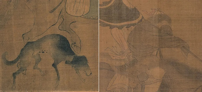 另外畫面中的胡漢官員都在馬上弓著腰,拿袖子或扇子擋住自己的臉,說明歸漢的路途非常艱苦,風(fēng)大沙狂氣候寒冷,歸途又漫長(zhǎng),久在馬上的匈奴武士尚且要弓腰取暖,躲避風(fēng)沙,左下角的狗據(jù)說是匈奴的名犬,現(xiàn)在像一條落水狗,已經(jīng)前胸貼后背了,這些細(xì)節(jié)都襯托出歸漢路途的艱苦。