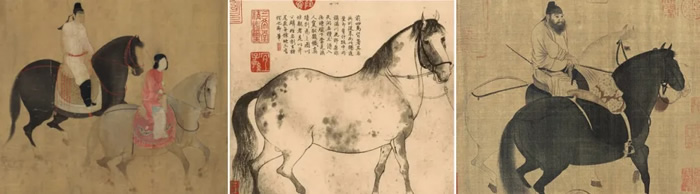 上為《文姬歸漢圖》、下左為趙佶摹《虢國(guó)夫人游春圖》、下中為李公麟的《五馬圖》、下右為韓干的《牧馬圖》之中的馬
