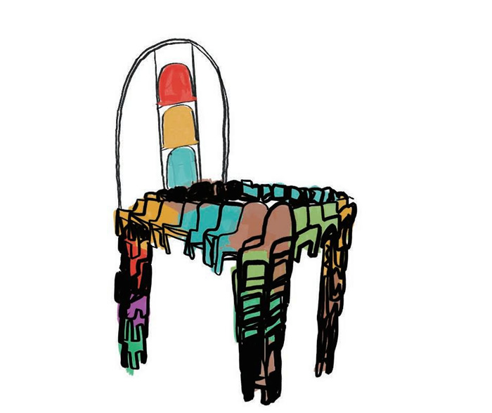 這件裝置作品是由許多椅子匯聚而成的巨型椅子。通 過對椅子的巧妙組合,打破常規(guī)認知,探索家具的藝術可能性,呈現出全新的藝術形態(tài)與空間概念,展現獨特的藝 術魅力與視覺沖擊。