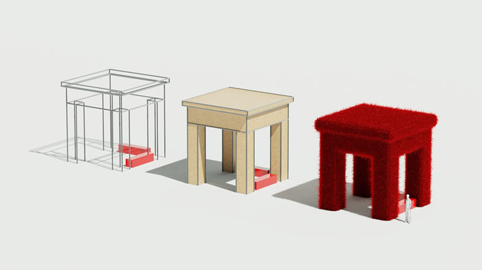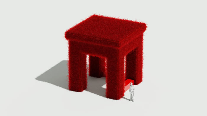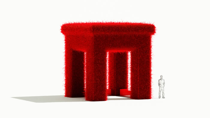Red Cube通過日常而親近的板凳形式,喚起人們對空間的哲學意義的深思。整個裝置被柔軟的紅色毛絨覆蓋,意在模糊公共與私人空間的界限,讓人們在開放的公共場所中找到個人的私密空間。