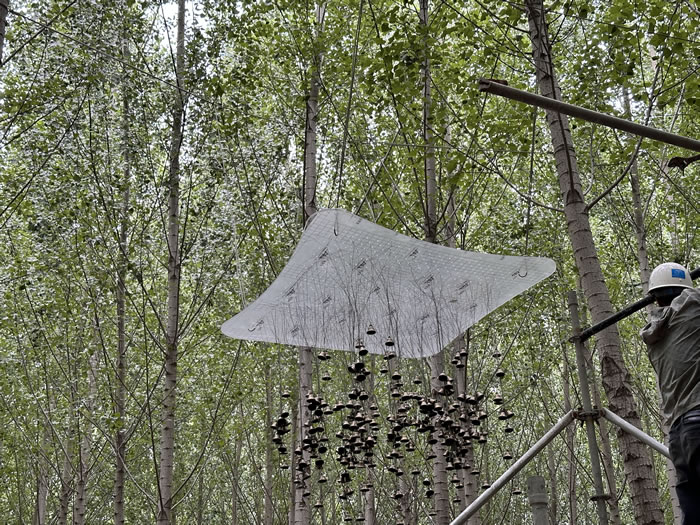 《Whisper·風(fēng)鈴》是一件結(jié)合自然環(huán)境和互動裝置藝術(shù)的作品,懸掛在樹林的高處,隱秘而神秘。這組風(fēng)鈴裝置旨在通過聲音與環(huán)境的交互,探索人與自然、人與藝術(shù)之間的微妙關(guān)系。將風(fēng)鈴作為主要材料,不僅因為其在多種文化中象征著神秘與通靈,更因其悅耳的聲音和視覺上的獨特性。風(fēng)鈴懸掛在樹林的高處,觀眾需要抬頭仰望,這種設(shè)計意圖營造一種向上探索與敬畏的氛圍。風(fēng)鈴在風(fēng)中輕輕作響,仿佛是大自然的竊竊私語。
