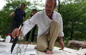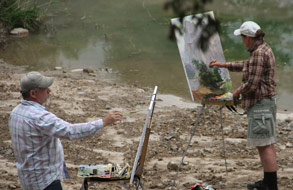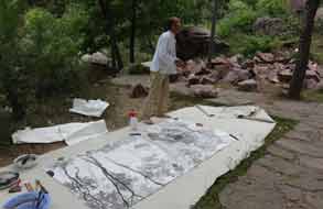 - “2014中外藝術(shù)家太行對(duì)話”的第六天,云朵遮住了陽(yáng)光,為藝術(shù)家們提供了絕佳的寫生環(huán)境。在已經(jīng)干枯的河床上,中外藝術(shù)家們進(jìn)入了忘我的創(chuàng)作狀態(tài)。