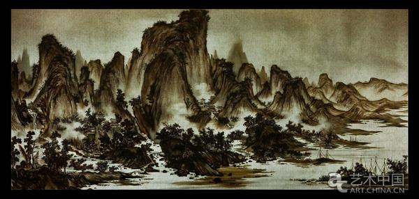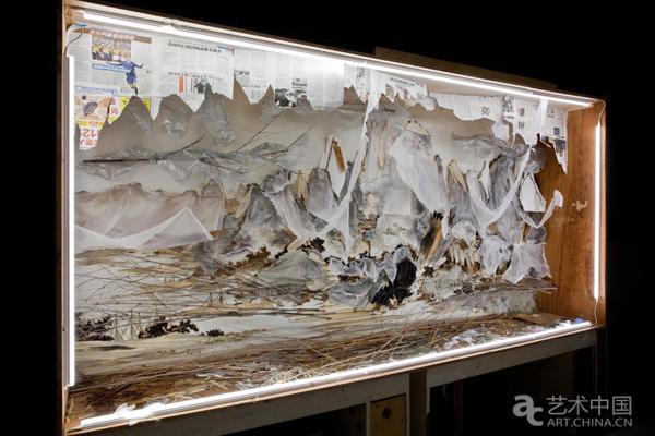 2004年,徐冰再次以山水畫傳統(tǒng)作為創(chuàng)作主題,但這一次,他放棄了一貫使用的筆、墨和紙,轉(zhuǎn)而嘗試裝置和燈箱。在這個(gè)名為《背后的故事》的系列里,徐冰選取極負(fù)盛名的古代大師作品為摹本,使用枯萎的植物和撕裂的塑料布等“非藝術(shù)性材料”,在光與影渲染下塑造出形似摹本的裝置作品。我們不僅可以看到作品的正面——標(biāo)志性的大師作品——而且能看到作品的背面——令人嘆為觀止的材料混合物,在光影的作用下以標(biāo)引符號(hào)性的方式呈現(xiàn)。通過這種方式,徐冰質(zhì)疑了山水畫創(chuàng)作的歷史和傳播方式,并提出這樣的思索:人與自然的關(guān)系是如何賦予這樣的創(chuàng)作以意義的呢?
