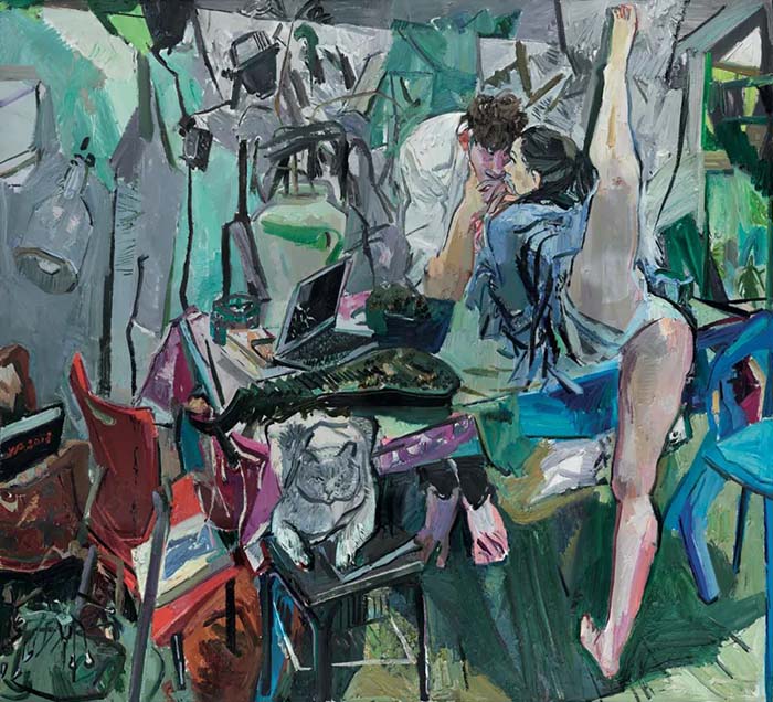 閆平的創(chuàng)作過(guò)程多數(shù)會(huì)借用模特,這是她習(xí)慣的繪畫(huà)方式,同時(shí)她對(duì)這些模特動(dòng)態(tài)的觀(guān)察和捕捉也直接影響到作品主題。創(chuàng)作于2016年的《在希臘的畫(huà)室里》就描繪了疫情前她帶著學(xué)生游學(xué)希臘時(shí)在租借的工作室寫(xiě)生的場(chǎng)景,畫(huà)面中當(dāng)?shù)啬L鬲?dú)特的氣息,讓她產(chǎn)生了不一樣的創(chuàng)作靈感:“那天來(lái)的模特有紋身并且紋在了女性特征的部位,讓我感到了情色,想著畢加索的因那些情人們而發(fā)生的那些好作品,想著弗里達(dá)·卡羅一生的病疼和愛(ài)情所帶來(lái)的那些令人難忘的自畫(huà)像,還有我身邊年輕的孩子們的興奮,有聲有色。我也常常觀(guān)察這些兩性的美好并試圖在其中發(fā)現(xiàn)創(chuàng)作的源泉。”與此同時(shí)呼應(yīng)著的還有創(chuàng)作于2018年的《走,我們到哪里去》,模特在室內(nèi)如鳥(niǎo)兒般飛翔的姿態(tài)雖處于畫(huà)布的右側(cè),但卻成為了整個(gè)畫(huà)面的中心,并引導(dǎo)著觀(guān)者從這些人物向四周的空間展開(kāi)看畫(huà)。