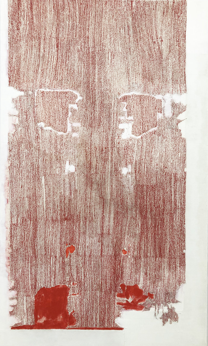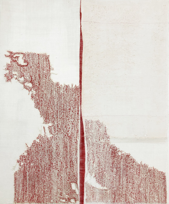 在《無(wú)序點(diǎn)云》系列作品中,我依然使用熟悉的創(chuàng)作材料“布和線”,不同以往的是,布的質(zhì)感隱藏于線之后,棉線承載著大面積的紅色,單純卻顯得有力量,象征著救贖和潔凈。我想只有最單純的色彩才能喚起最強(qiáng)烈的心靈感受,回到繪畫(huà)本身,用純粹的紅色去探索繪畫(huà)的潛力和更多的可能性。