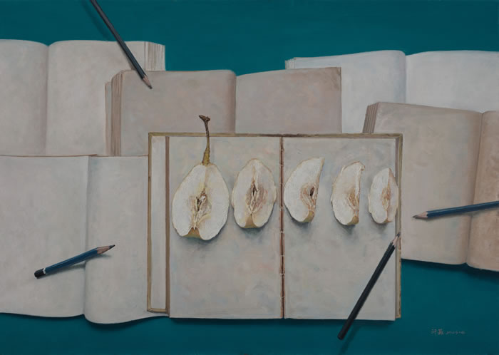 近期的作品用蔬果與書籍為題材,果腹的蔬菜水果與傳播精神文化的書籍,代表了兩個層面?!靶味险咧^之道,形而下者謂之器”。試圖用繪畫的方式把道與器之間的關(guān)聯(lián),用繪畫的形式進(jìn)行的詮釋。人生有不同的年齡階段,也有不同的認(rèn)知階段,還有不同的生活境遇。接觸層面有所不同,不同階段對道與器的認(rèn)識和體悟自是不同。這里面有很多話可說。老子說道可道非常道,繪畫的圖式剛好可以去提示或暗喻某些“道”的智慧。