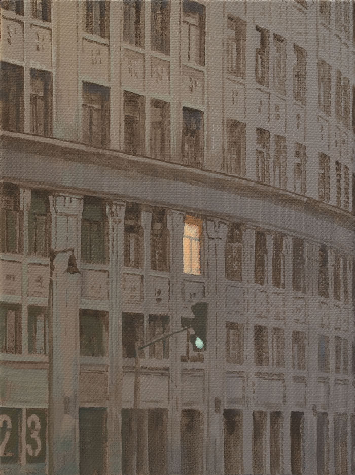 魯?shù)さ男伦髌贰渡虾4髲B》、《武康大樓》等等,與之前的《海上》系列——常德公寓,麥琪公寓,衡復中心一樣,畫的都是上海著名的地標性建筑,只不過與后者聚焦建筑的局部相比,新作更加完整大氣。這些作品并不能簡單地被歸類于城市風景畫,因為在這些方寸之間的小幅作品中,魯?shù)故斓膶憣嵓记珊秃畹氖闱槭址ㄗ巫尾痪氲赜涗浟松虾5囊粋€個角落,并且以嚴謹?shù)难芯繎B(tài)度準確地重現(xiàn)著當時當?shù)氐墓饩€。作為近代中國開埠最早的城市之一,照明燈光在上海的城市發(fā)展史中有著特殊的意義,沒有什么比光線更能夠忠實地記錄城市的每個角落并且反映每個角落的情緒了。魯?shù)な且晃粚ι虾S兄詈窀星榈乃囆g家,在他的筆下,粗礪的建筑外墻在陽光下有著近乎抽象畫一樣強烈的明暗對比,夜晚大廈窗口零星的燈光似乎講述著一個個動人的故事。魯?shù)ぴ谧髌分忻枥L了室內(nèi)和室外的各種光,溫和的自然光,強烈的陽光,晚上的燈光,以有限的畫筆捕捉無限變換的光線,令人著迷。