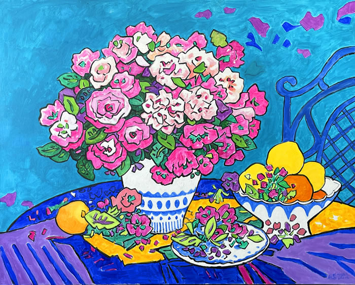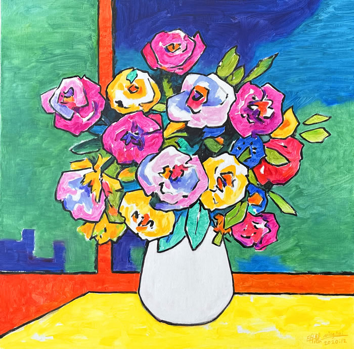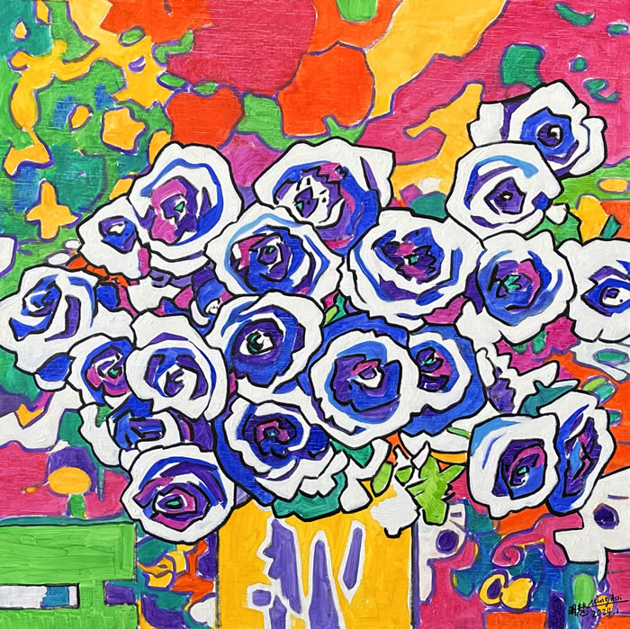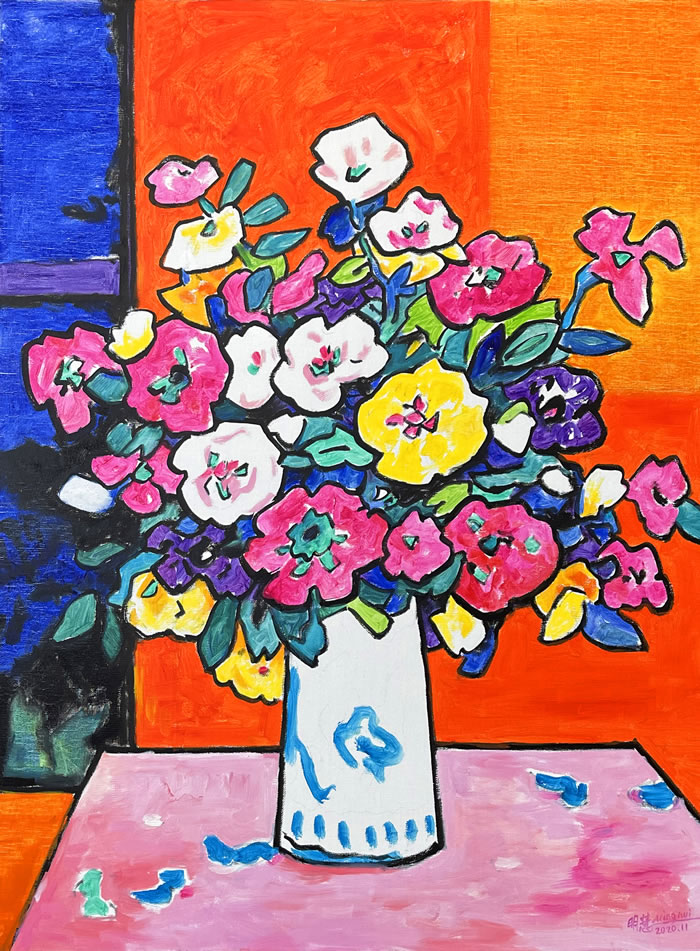因?yàn)閻刍▋海医杌ó嬚Z訴說情懷,借繪畫本身把我內(nèi)心對花兒最美好的愿望鎖定在我的畫面里。我嘗試著用我自己的方式表達(dá)對花兒的情感和情緒。我不斷地追求在繪畫語言上的精簡和形式美的探索,不刻意強(qiáng)調(diào)畫面的立體與空間,而是通過高純度色彩間的構(gòu)成關(guān)系來營造花兒與花兒競相斗艷的強(qiáng)烈視覺效果,盡可能地將花兒的美麗與生命力展現(xiàn)得淋漓盡致。強(qiáng)烈的色彩對比是我對花兒的感悟和發(fā)自內(nèi)心的真實(shí)情感和情緒表述。