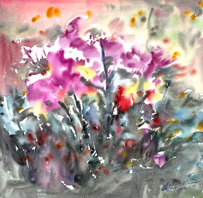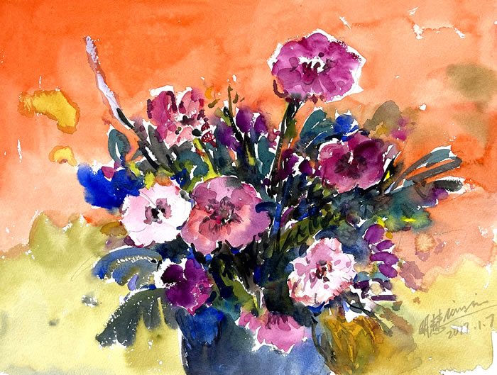 花兒與生俱來的美麗和個(gè)性,只有用心去觀察去感悟才能真正發(fā)現(xiàn)它們內(nèi)在的美麗和神奇。 在大學(xué)一年級學(xué)習(xí)《裝飾花卉》課程的時(shí)候我對花兒就有了一知半解的認(rèn)知。早年的水粉畫、水彩畫靜物寫生作品花兒又是我比較喜歡多用的素材。隨著對花兒的喜好和認(rèn)知的提高,從2006年開始我創(chuàng)作了一批干花兒系列作品,2013年以后花卉創(chuàng)作基本上成為我繪畫的重要題材。