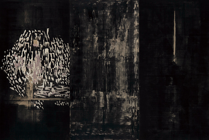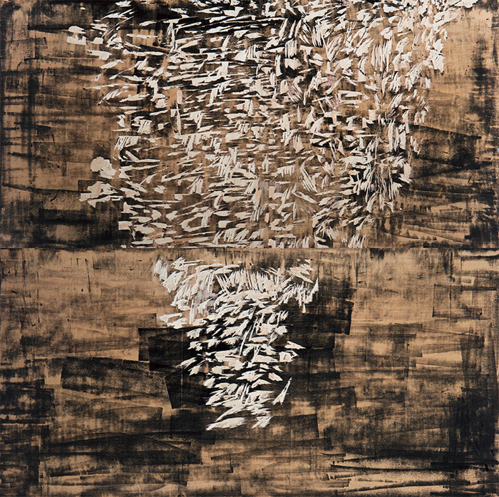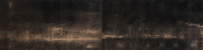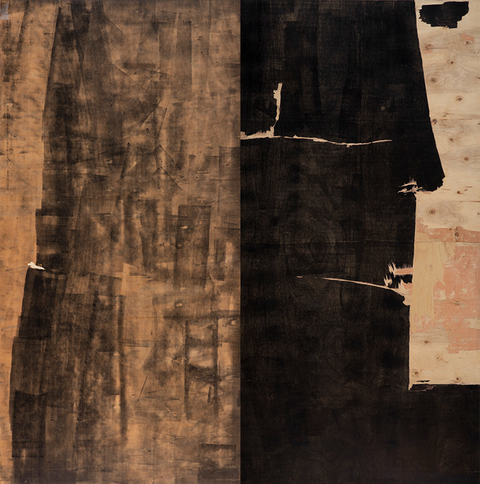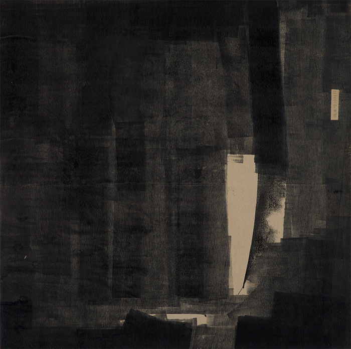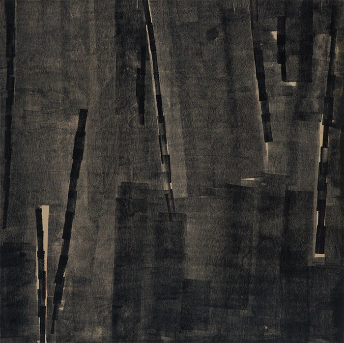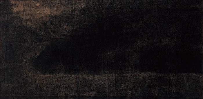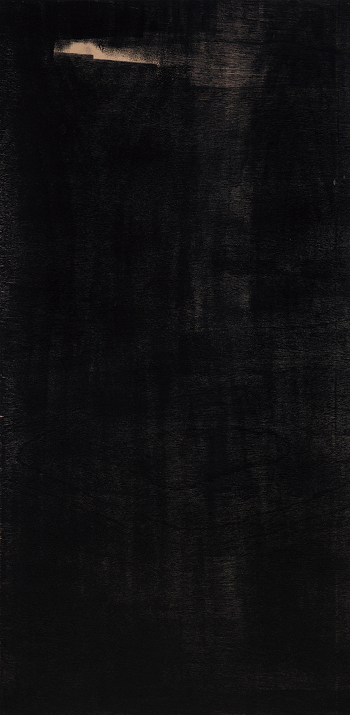 王綺彪改變了油墨和木板的傳統(tǒng)功能,在他這里,油墨成了他的“板象藝術”唯一使用的“色彩”,他將沾滿油墨的滾軸變成沾滿“色彩”的“畫筆”,在木質板材表面滾動。一方面,手臂不同的壓力和滾軸的快慢形成了墨色隨機的深淺濃淡變化,使油墨在板材上呈現(xiàn)出水墨大寫意神韻,卻又極富油畫般的厚重感和塑造性;另一方面,他通過油墨滲向木紋肌理產生的板材纖維筋絡的僨張,以及板材自身豐富錯落的天然木色,共同形成酷似中國古代帛畫的面貌,產生深沉感和神秘性,距離感和深邃性,營造出一種陌生又熟悉的奇異空間。這個奇異空間里,王綺彪一刀未動,傳統(tǒng)木刻版畫的命脈:刀法,在此消失殆盡,繼之而來的,是王綺彪的“墨·板”世界的誕生。