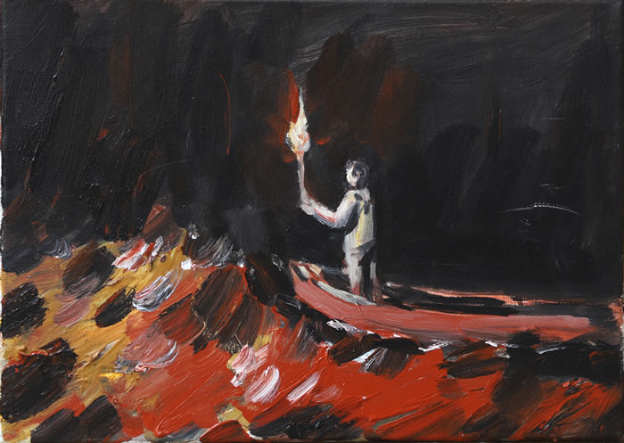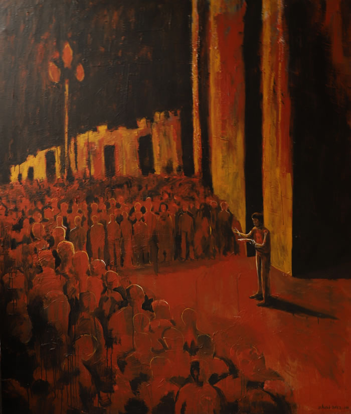 翟春陽(yáng)的繪畫(huà)中反復(fù)出現(xiàn)擎著火把的人,火把的光芒似乎在指引著某個(gè)方向,同時(shí)也照耀著無(wú)意識(shí)地聚集在一起的荒誕的人群。這是一個(gè)隱喻——為諸眾帶來(lái)光明與熱情的盜火者隱喻,這個(gè)隱喻并非普羅米修斯從太陽(yáng)神那盜火種為人類(lèi)獻(xiàn)祭般宏大,對(duì)翟春陽(yáng)而言,這是一個(gè)反復(fù)出現(xiàn)在腦海中的形象,揮之不去因而信手涂繪,或許,這個(gè)盜火者的隱喻僅僅只是向內(nèi)的。另一個(gè)關(guān)于火的隱喻或許更接近翟春陽(yáng)的真實(shí)意圖,在柏拉圖的“洞穴之喻”(3)中,有一個(gè)有意思的推論:如果逃出洞穴的囚犯看到了真實(shí)的世界,他將如何說(shuō)服那些把墻上的影子當(dāng)作真實(shí)世界的囚犯放棄虛幻的執(zhí)念?這個(gè)說(shuō)服的過(guò)程意味著某種危險(xiǎn),因?yàn)樗鲎呖吹搅苏鎸?shí)的世界之后,看墻上的影子甚至不如一直呆在洞穴里的囚犯看得更清晰,他的說(shuō)教很可能被當(dāng)作某種愚蠢的行為,最后的結(jié)局很可能不是為洞穴里的囚犯指明出路,反而有可能被囚犯?jìng)児铝⑸踔寥浩鸲ブ?。但是如果出逃者盜走了囚犯?jìng)兩砗蟮幕鸢?,或許囚犯?jìng)儠?huì)意識(shí)到墻上的影子的虛無(wú)性并進(jìn)而關(guān)注到自身存在及改變命運(yùn)。翟春陽(yáng)對(duì)繪畫(huà)藝術(shù)的堅(jiān)持以及對(duì)藝術(shù)圈的疏離一方面意味著對(duì)傳統(tǒng)理念的悖離,另一方面也意味著精神上的自我重建。翟春陽(yáng)正是像一個(gè)逃出洞穴的藝術(shù)家,卻又試圖回到洞穴做一個(gè)繪畫(huà)藝術(shù)的盜火者,他在繪畫(huà)和藝術(shù)上的實(shí)踐組成了一個(gè)綿延的“盜火計(jì)劃”。