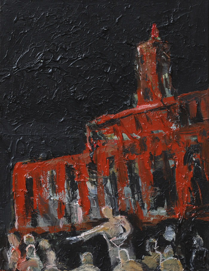 無(wú)論是對(duì)環(huán)境的反映還是情感的表達(dá),從技術(shù)進(jìn)步的角度而言,影像、裝置、多媒體以及數(shù)字藝術(shù)等確實(shí)可以制造很多視覺(jué)上的刺激,但是繪畫(huà)作為根植于意識(shí)深處的符號(hào)化語(yǔ)言,就視覺(jué)或者心理上的共振而言更加直接、強(qiáng)烈且恒久!翟春陽(yáng)的繪畫(huà)充滿了表現(xiàn)主義的情感張力,筆觸自由、迅捷而飽滿,色彩同樣充斥著飽滿的情感宣泄,但事實(shí)上翟春陽(yáng)非常謹(jǐn)慎地使用大面積的灰度色系把一些歷史的或者個(gè)人的情緒非常直白地置于畫(huà)面之上,而非鮮艷奪目的色彩,通常僅僅使用沉寂的血紅或者冷灰色調(diào),這營(yíng)造了畫(huà)面的歷史感,是對(duì)某種特定情緒的強(qiáng)化,也具有一種素描的力量感。翟春陽(yáng)的畫(huà)法摒棄了那種學(xué)院的嚴(yán)謹(jǐn)性和油滑的熟練性,從藝術(shù)家過(guò)往的經(jīng)歷來(lái)看,當(dāng)是有意識(shí)地保留了這種野性的語(yǔ)言,這使得畫(huà)面更加具有說(shuō)服力。這種畫(huà)法從精神內(nèi)核而言與一段時(shí)間以來(lái)藝術(shù)界流行的“壞畫(huà)”法有共通之處,都以粗礪解構(gòu)精良,但是并不反繪畫(huà)。