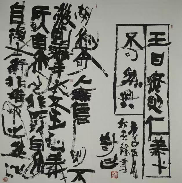作為以中國傳統(tǒng)藝術(shù)為根基,融合中西繪畫精髓并大膽創(chuàng)新的當(dāng)代藝術(shù)家,深諳傳統(tǒng)書法的筆墨精髓,卻以“破格”聞名。他融碑帖之骨、文人畫之境于一體、篆隸的蒼勁與行草的飄逸交織,似山巒起伏,又如江河奔涌。王清州的創(chuàng)作始終秉持“以書載道”的理念,在筆墨的收放間,傳遞對自然與人文的深沉眷戀。