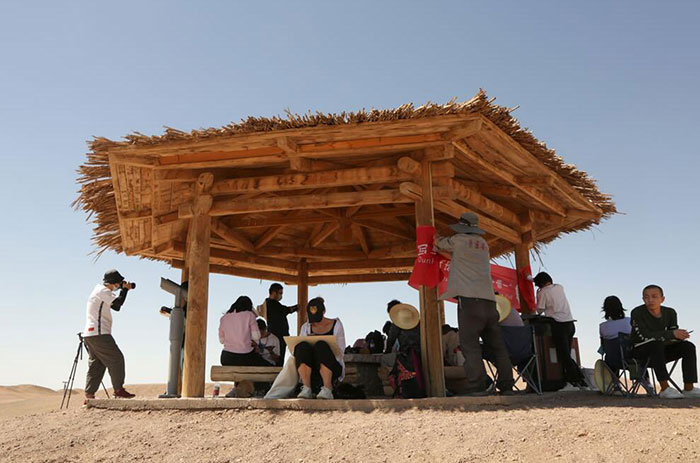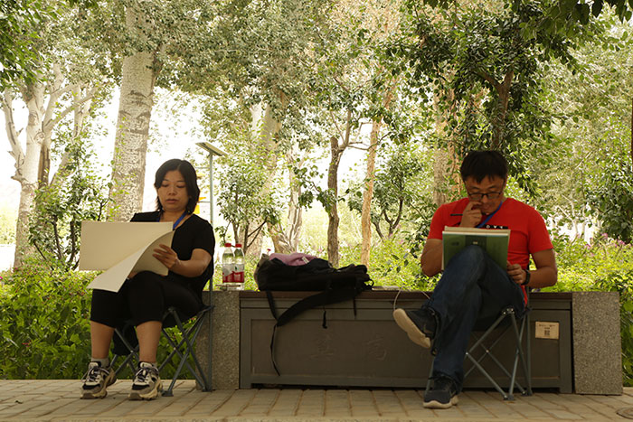 中外藝術(shù)家在陽關(guān)景區(qū)涼亭集體寫生 攝影:劉鵬飛