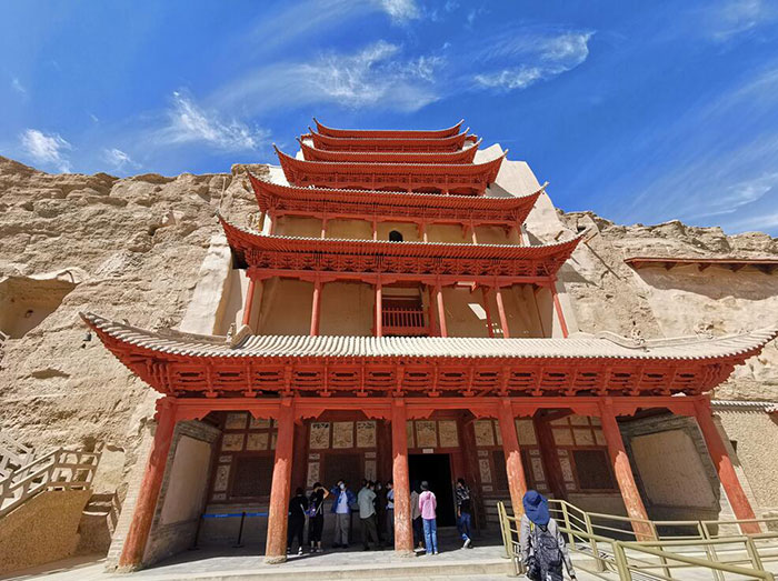 公元366年,高僧樂僔在敦煌三危山上開鑿了莫高窟的第一個洞窟,經(jīng)過持續(xù)千年的營造,莫高窟成為世界上現(xiàn)今保存最完整、規(guī)模最宏大的佛教石窟藝術(shù)群,保留有大量營造于魏晉、隋、唐、五代、西夏、元等朝代的佛造像與經(jīng)變壁畫。由于敦煌所處的河西地區(qū)氣候干燥,現(xiàn)存莫高窟內(nèi)的石窟藝術(shù)、佛造像和經(jīng)變壁畫基本保存完好。洞窟通常由建筑形制、彩塑和壁畫共同構(gòu)成。正壁一般開壇塑像,窟頂和四壁繪滿壁畫,夢幻般地展現(xiàn)了佛國世界。