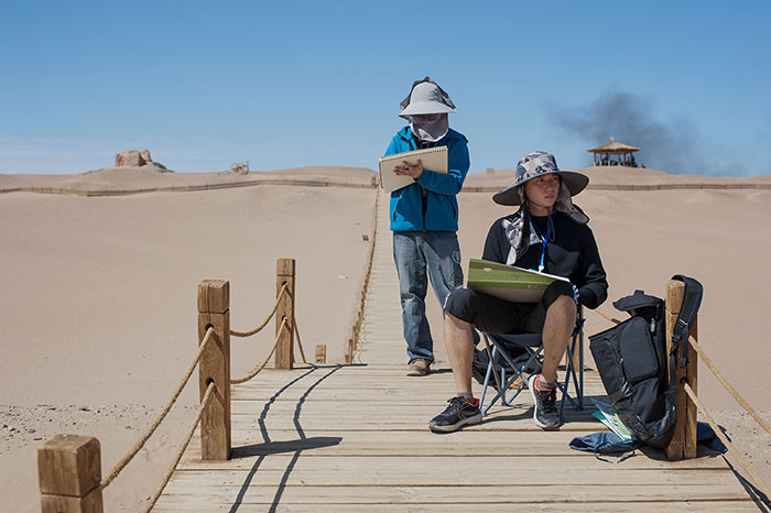 西北師范大學(xué)美術(shù)學(xué)院副教授岳鋒和西北師范大學(xué)美術(shù)學(xué)院院長王玉芳在西千佛洞前寫生 攝影:劉鵬飛