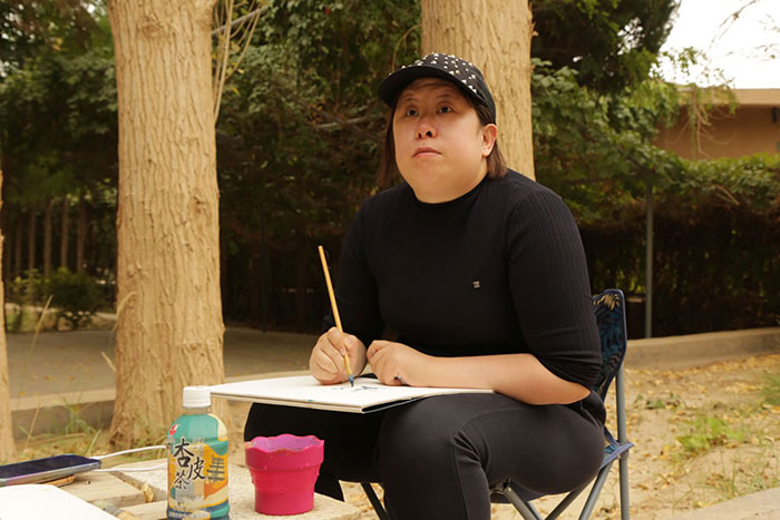 日本藝術(shù)家山仲可文在黨河岸邊寫生 攝影:劉鵬飛