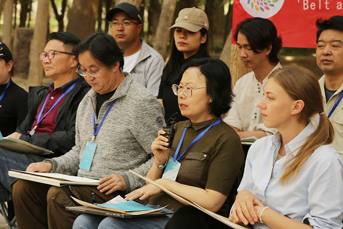 9月1日下午,藝術(shù)家在西千佛洞景區(qū)和黨河沿岸寫生創(chuàng)作。傍晚時分,中外藝術(shù)家在西千佛洞前舉行了寫生活動交流分享會。藝術(shù)家們帶著近幾天的寫生創(chuàng)作,分享了他們的感想和體會。