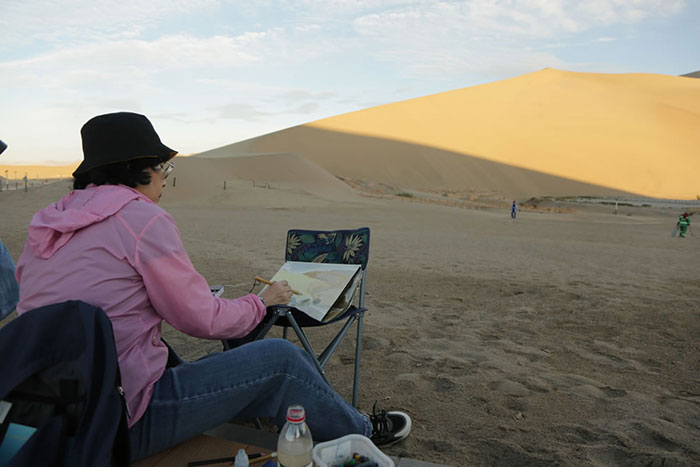 西北師范大學(xué)美術(shù)學(xué)院院長王玉芳在鳴沙山寫生 攝影:劉鵬飛