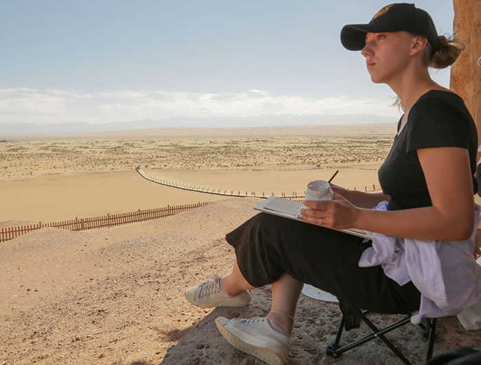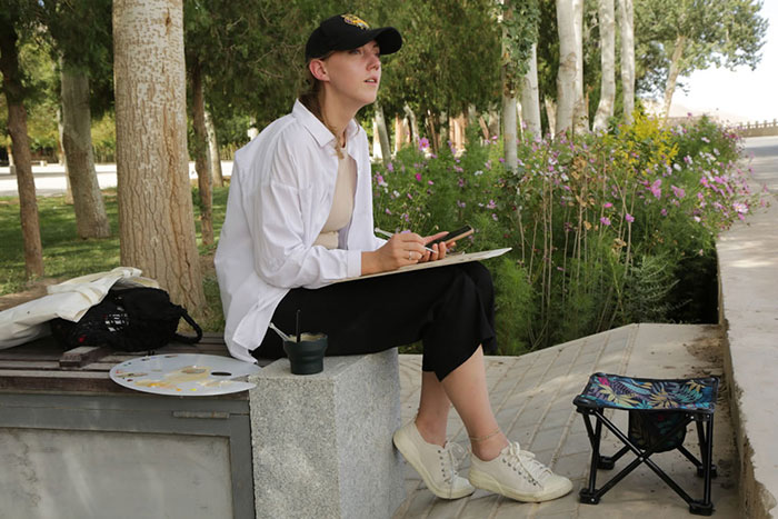 俄羅斯藝術(shù)家佩列佩利欽·安娜斯塔西婭(Perepelitcyna Anastasiia)在陽關(guān)景區(qū)創(chuàng)作 攝影:劉鵬飛