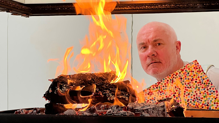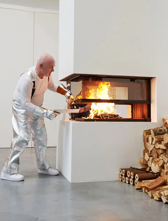 現(xiàn)年57歲的達(dá)明安?赫斯特身穿防火防熱的特制衣服和手套,一身輕松的將畫(huà)作投入六個(gè)玻璃火爐當(dāng)中,還時(shí)不時(shí)朝鏡頭扮個(gè)鬼臉。