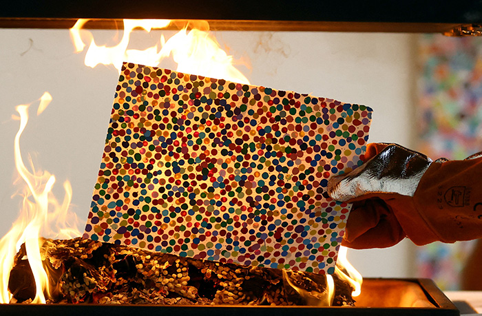 在當(dāng)?shù)貢r(shí)間10月11日,英國(guó)最有錢(qián)的藝術(shù)家達(dá)明安?赫斯特(Damien Hirst)開(kāi)始燒毀自己的畫(huà)作,在眾多記者與直播鏡頭面前,藝術(shù)家將作品一張接一張的塞進(jìn)燃燒的爐子里。