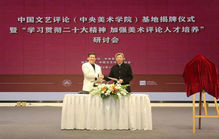 中國文藝評論家協(xié)會副主席兼秘書長、中國文聯(lián)文藝評論中心主任徐粵春與中央美術(shù)學(xué)院院長、中國美術(shù)家協(xié)會主席范迪安共同簽署《中國文藝評論基地(第二批)共建協(xié)議》