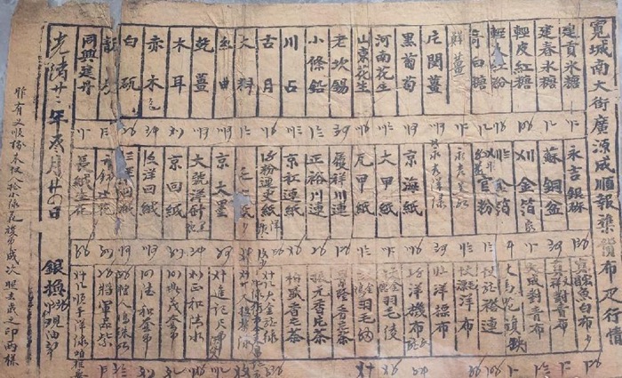 光緒二十二年寬城南大街廣源成順報雜貨布疋行情價目單 圖源:孔夫子舊書網(wǎng)