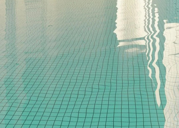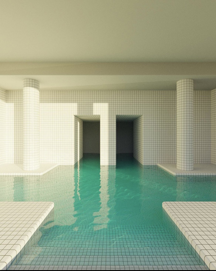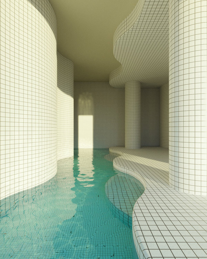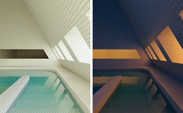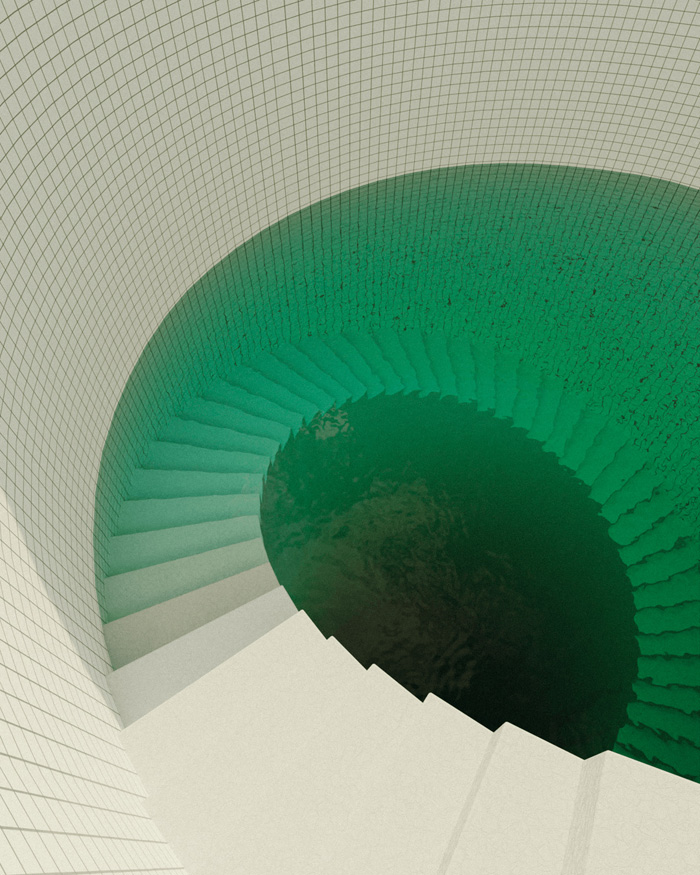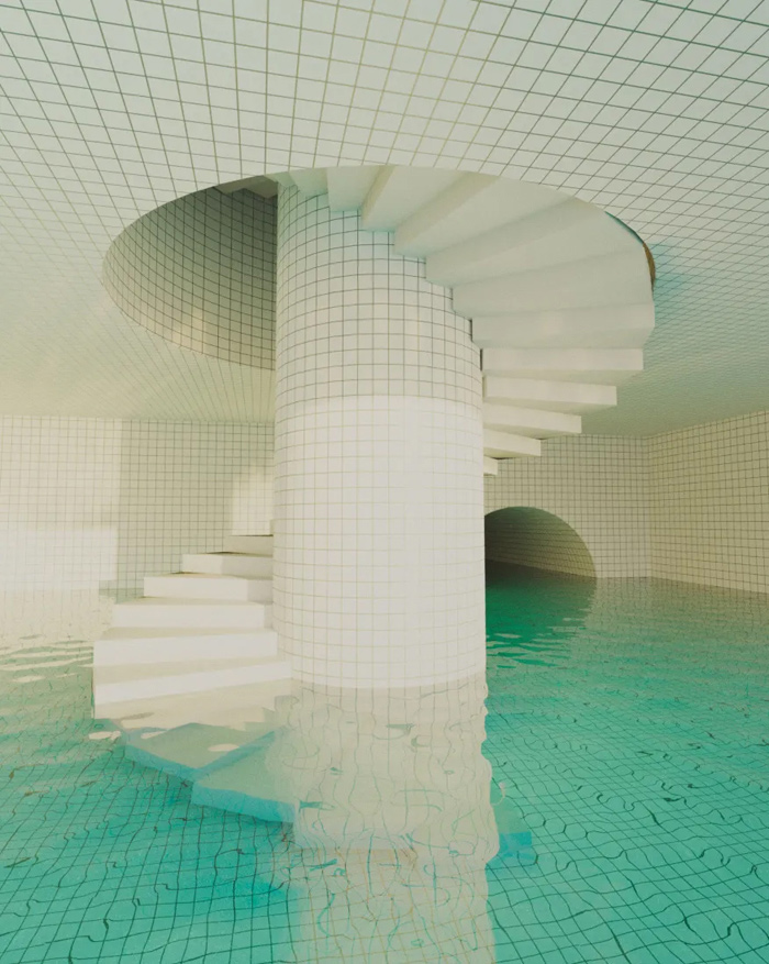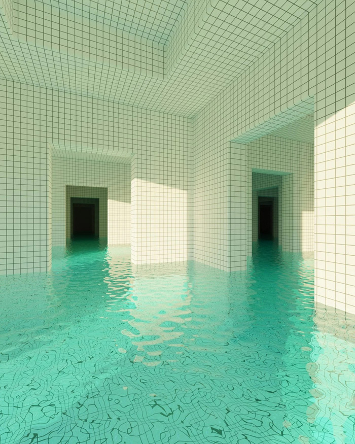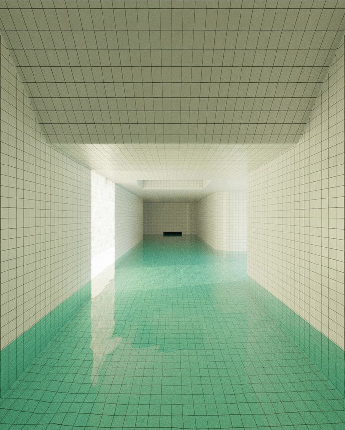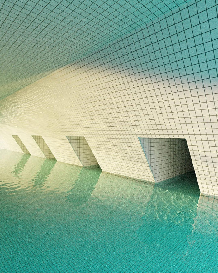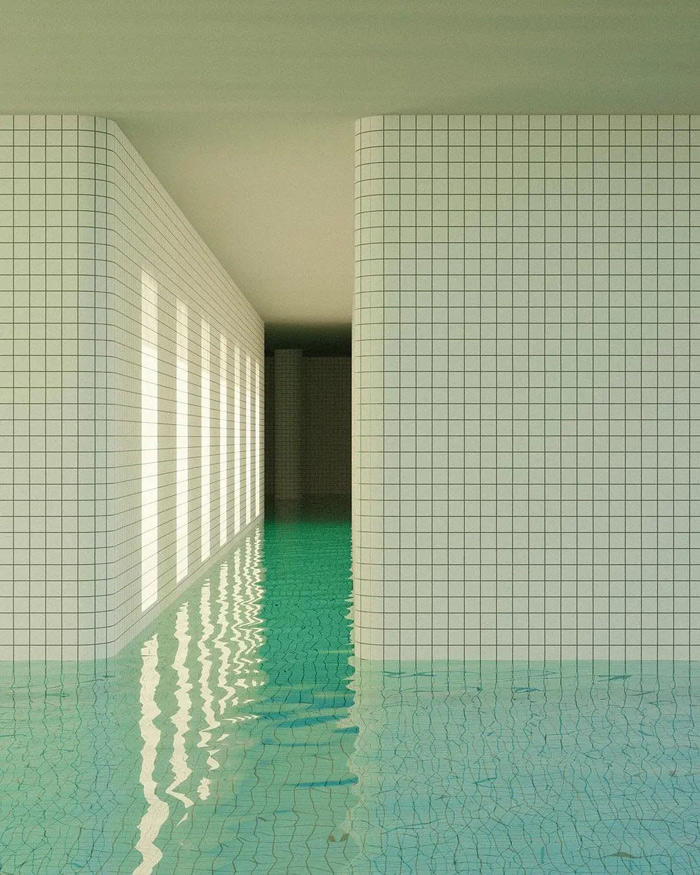 作品中的游泳池,無論是綠松石的瓷磚還是通透的水面,在現(xiàn)實生活中的游泳池當(dāng)中十分常見;然而那些非人類的建筑結(jié)構(gòu)、深處的未知陰暗空間又在告訴你這個場景的不真實性。