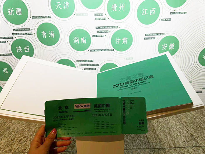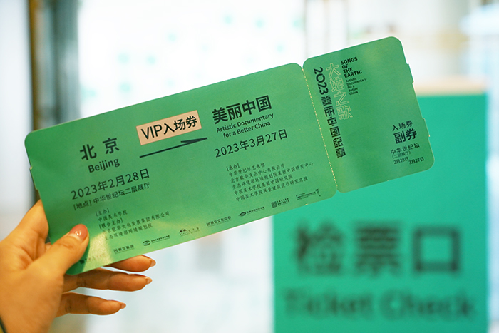 檢票口處,響起火車進站的鳴笛聲,手持一張綠色車票,親赴一場“美麗中國”的文化之旅——2023年2月28日,由中國美術學院主辦的“大地之歌——2023美麗中國紀事”展在中華世紀壇藝術館開幕。