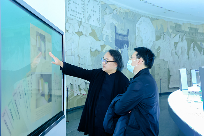 美麗中國研究院副院長,本次展覽策劃人汪莎為中國美協(xié)主席范迪安介紹展覽