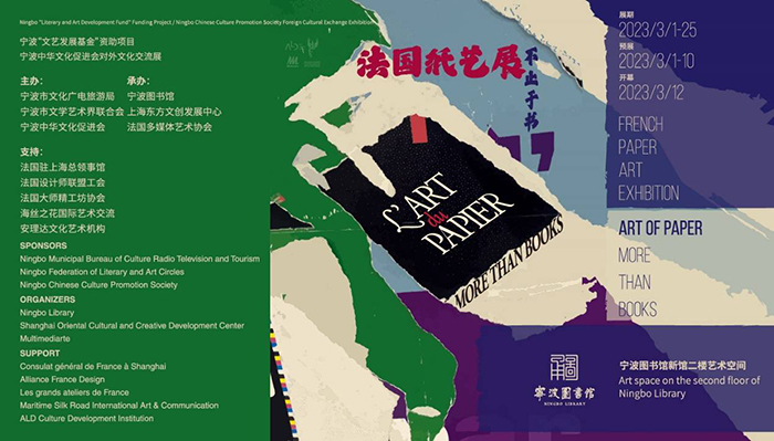 2023年3月12日,“不止于書Ⅱ——法國(guó)紙藝展”在寧波圖書館開幕。本次展覽由寧波市文化廣電旅游局、寧波市文學(xué)藝術(shù)界聯(lián)合會(huì)、寧波中華文化促進(jìn)會(huì)聯(lián)合主辦,寧波圖書館、上海東方文創(chuàng)發(fā)展中心、法國(guó)多媒體藝術(shù)協(xié)會(huì)承辦。作品通過海絲之花國(guó)際藝術(shù)交流平臺(tái)引入國(guó)內(nèi),本次主題展覽得到了法國(guó)駐滬總領(lǐng)事館、法國(guó)設(shè)計(jì)師聯(lián)盟、法國(guó)大師精工坊協(xié)會(huì)、安理達(dá)文化藝術(shù)機(jī)構(gòu)的支持。