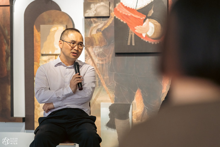 開幕式上,中央美術(shù)學(xué)院美術(shù)館館長、教授、博士生導(dǎo)師張子康先生專程到場祝賀并發(fā)表致辭,他表示:“多年來,藝術(shù)家張見始終在創(chuàng)作實踐與試驗中不斷推進,同時他也是一位特別優(yōu)秀的老師,在與同學(xué)生們的交流中,張見多是在思想觀念層面加以引導(dǎo),這一點從現(xiàn)場展出的眾多精彩作品中足以窺見。作品《當(dāng)<夜巡>來到中國》借中國工筆畫和傳統(tǒng)壁畫的綜合呈現(xiàn),以及展陳上的鏈接疊加,令我們看到古典主義與新工筆繪畫的碰撞,這一后現(xiàn)代的表達方式,更為當(dāng)代藝術(shù)構(gòu)建出文化層面的新的認知與思考?!?/p>