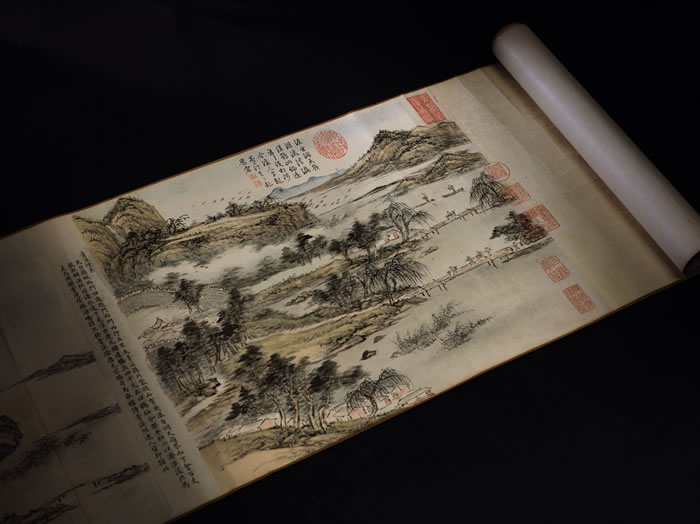 《石渠寶笈續(xù)編》著錄錢維城《臺(tái)山瑞景圖》卷,分段繪制浙江天臺(tái)山十景。天臺(tái)山為著名的“佛宗道源”,所圖皆為“瑞景”。錢維城以筆代帝王之目,將瑰麗的浙東山水繪成一卷進(jìn)呈乾隆帝,以遂其臥游之心愿。乾隆帝則是在錢維城去世兩年后再度展卷,以十首流利雍容的御制詩,與這位曾經(jīng)的“愛臣”再度互動(dòng)。題詩中“衡文寫境人,與彼同千載”,君臣相惜之情可見一斑。