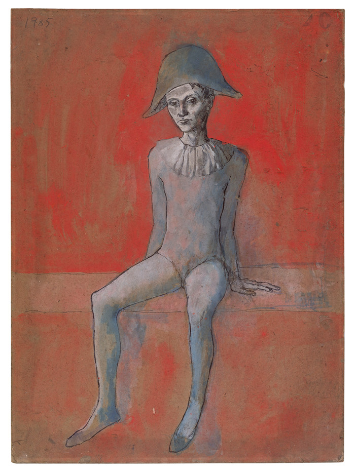 巴勃羅·畢加索 《坐著的丑角》 1905 紙板上水彩與黑墨水 57.2 × 41.2 cm 國(guó)立博古睿美術(shù)館-柏林國(guó)家博物館聯(lián)盟 NG MB 5/2000 ? Succession Picasso 2023 攝影:bpk圖片社/國(guó)立博古睿美術(shù)館-柏林國(guó)家博物館聯(lián)盟/延斯·齊厄